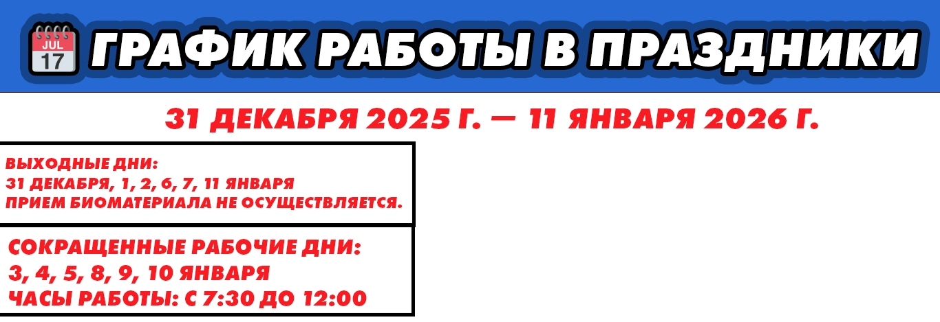 - 3, 4, 5, 8, 9, 10 января 2026 г.– рабочие дни по графику субботы с 7.30 до 12.00 для пунктов забора биоматериала по ул. Маяковского 49, ул. Черновицкая 22/46, ул. Новоселов 58, ул. Новаторов 2 кор.4, ул. Октябрьская 26, ул. Куйбышевское ш. 8, ул. Связи 18Б, ул. Фирсова 14.